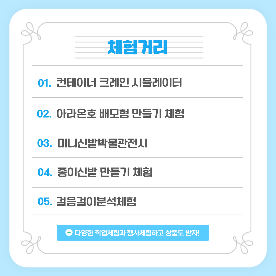 * 크레인 시뮬레이터, 선박모형․종이신발․김 만들기, 미니신발박물관 전시, 걸음걸이 분석 체험, 가상전시 제작 등