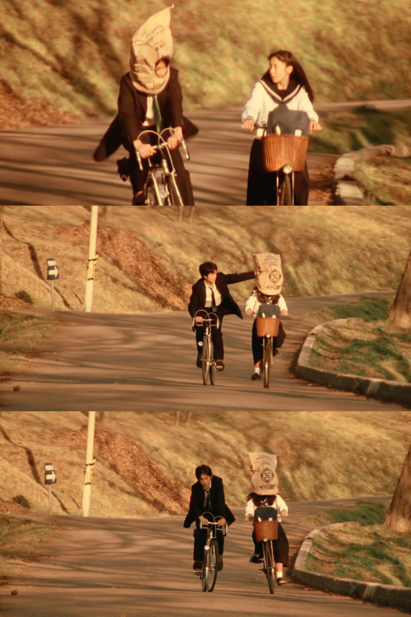 그중 하나는 등교길 아침 햇살을 받으며 자전거를 타고 내려가는 소녀 후지이 이츠키에게 소년 후지이 이츠키가 종이봉투를 씌우는 장면이었죠. 어린 시절, 장난스럽지만 풋풋했던 감정이 그대로 묻어 있던 장면이었습니다. 이장면은 그냥 휙 지나가는 장면이지만 여주가 지나가길 기다리며 무심하척 기다리고 있었을 소년의 두근두근한 심장의 떨림이 느껴지는 장면이었습니다. 누군가에게 특별한 관심을 갖고 있으면서도, 그것을 표현하는 방식은 너무 서툴고 엉뚱했죠. 하지만 오히려 그 서투름이 첫사랑의 본질이 아니었을까요?