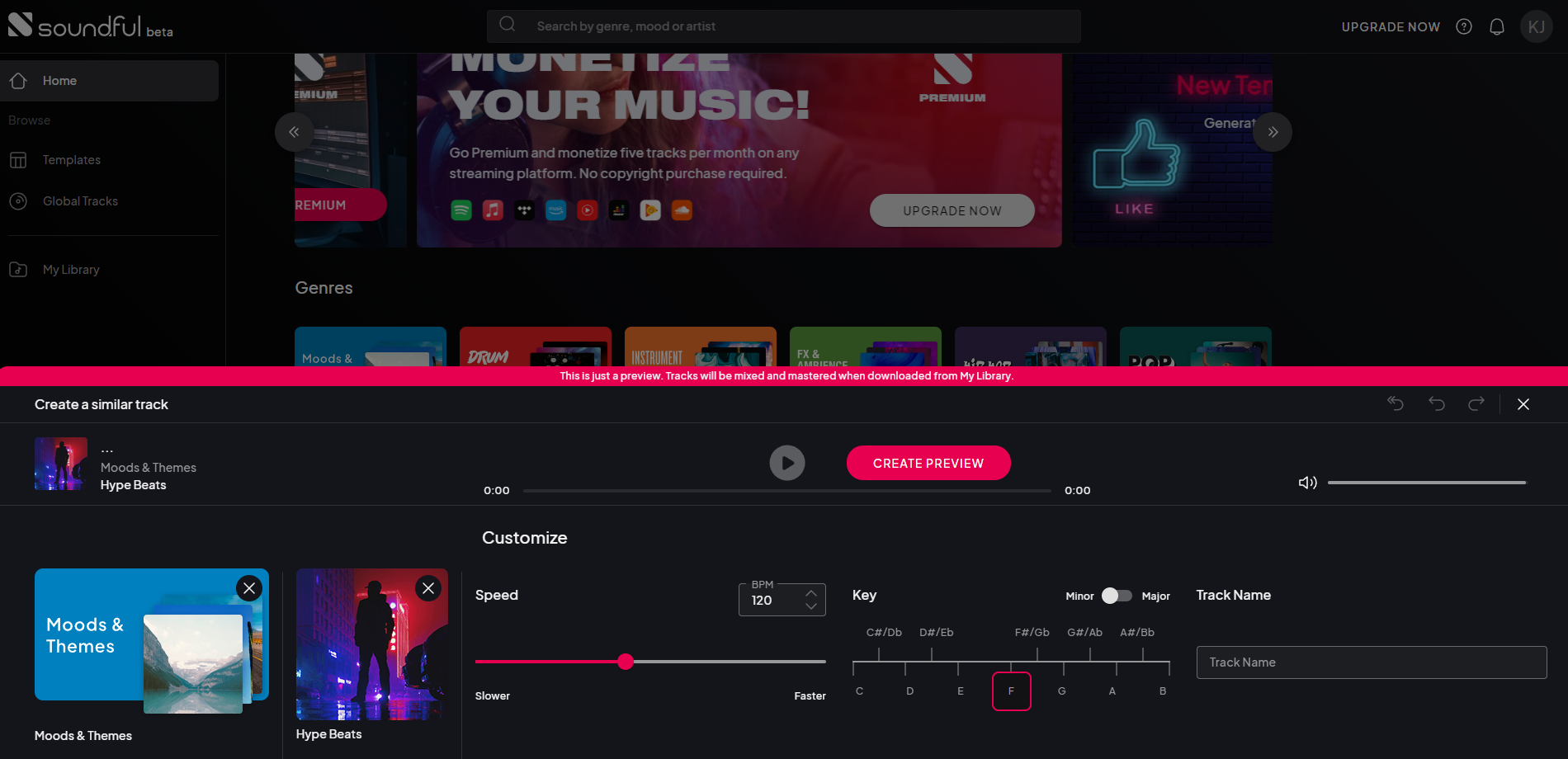 선택 후 BPM(곡 빠르기: 기본 세팅값이 있어 최소치와 최대치가 고정됨)과 Key(음정) 마지막으로 major와 minor(장조와 단조)를 선태해주시고 중앙의 빨간색 버튼 Create preview를 눌러 주시면 곡이 생성됩니다.