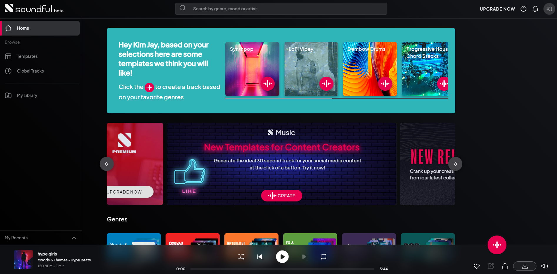 왼쪽 위 Home에서 좋아하는 장르를 고르던 아니면 Templates에서 선택해도 됩니다. 또는 Golbal Tracks에서 맘에드는 음악을 미리들어보고 오른쪽 아래 트랙을 골라 새로은 음악을 만들거나 아니면 미리 고른 트랙과 유사한 음악을 선택하여 생성할 수 있습니다.